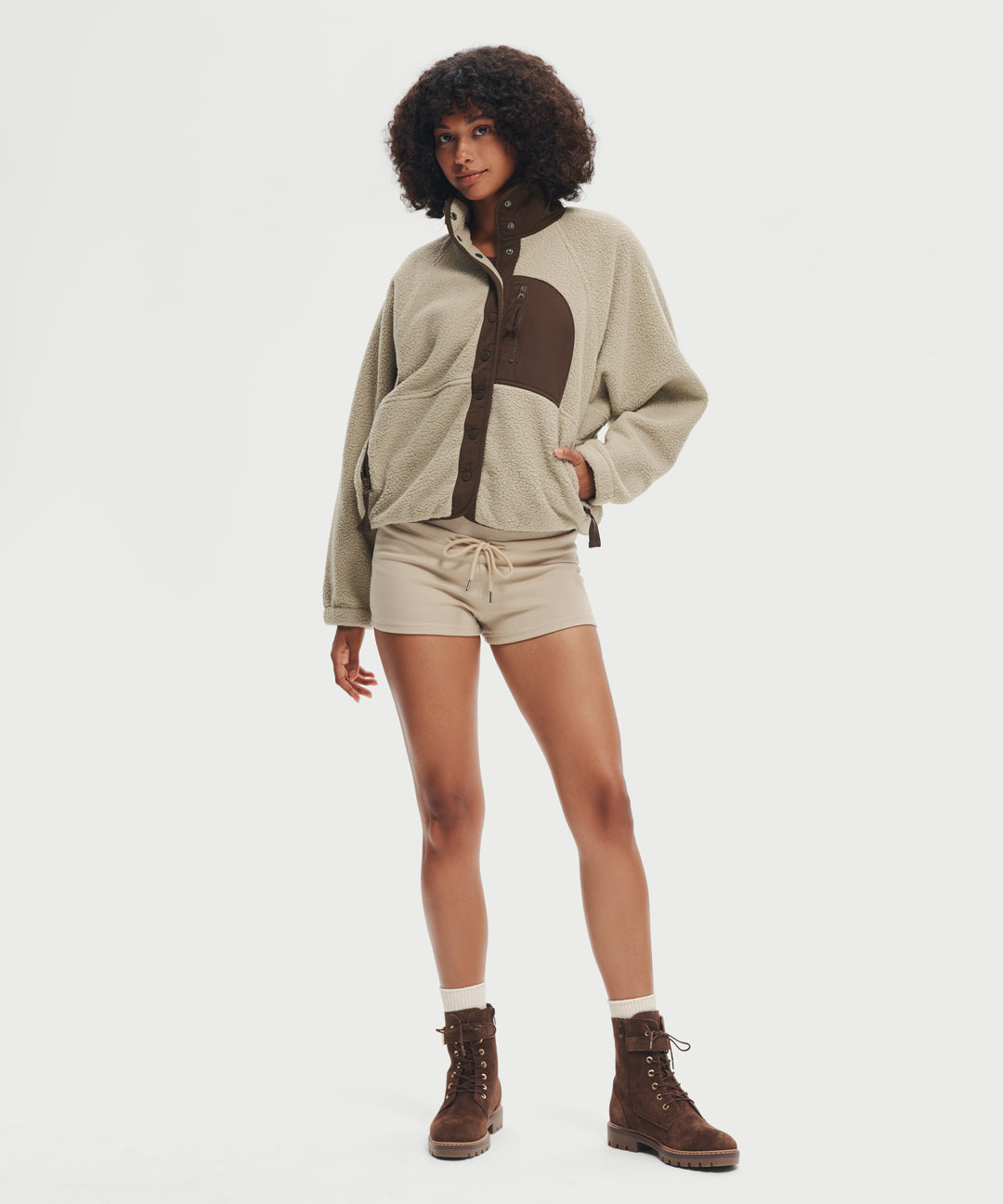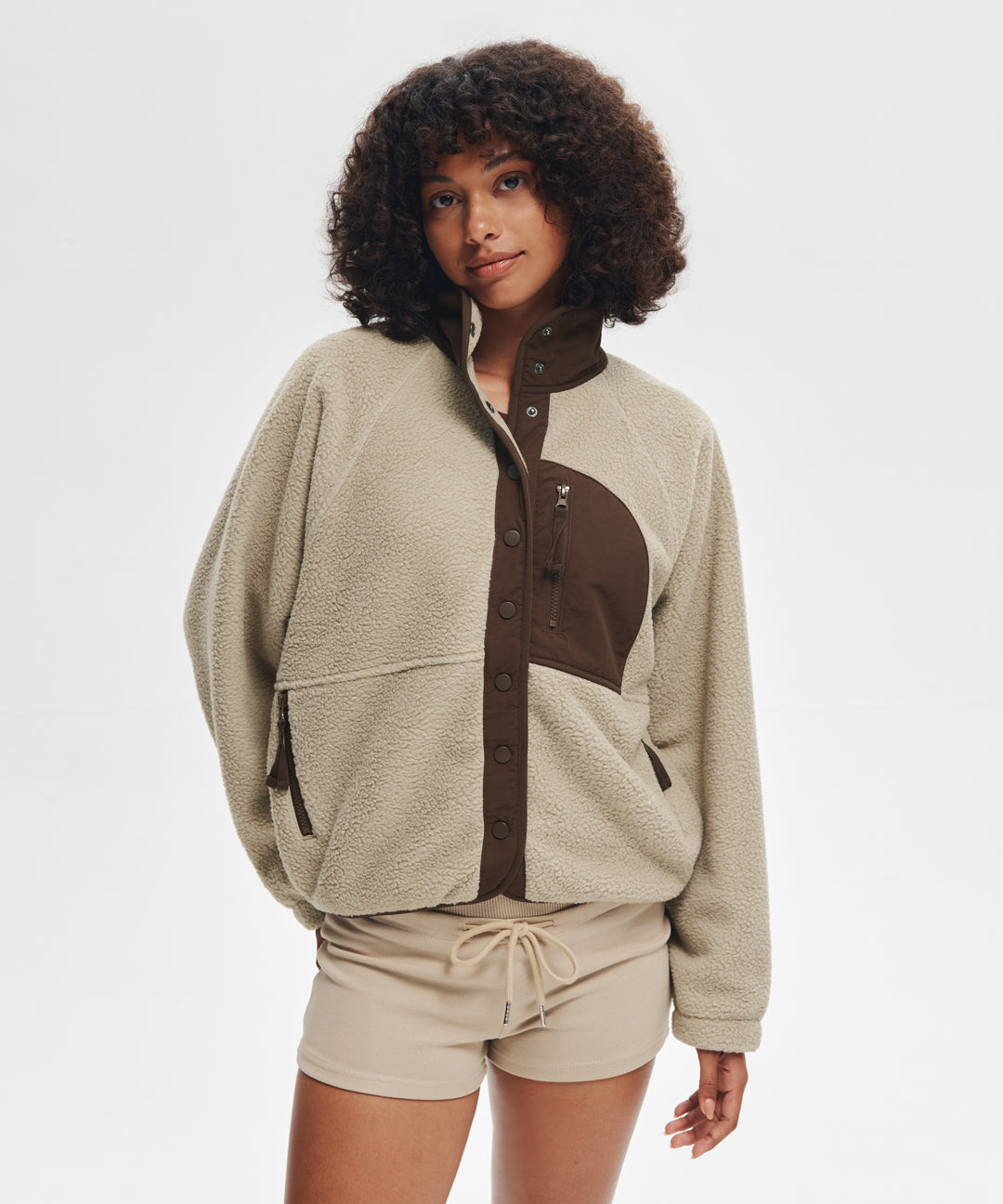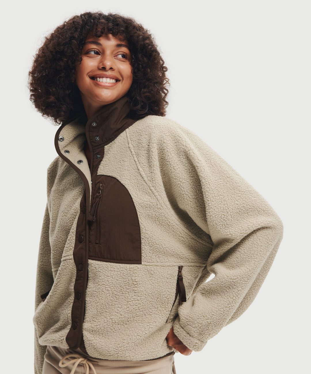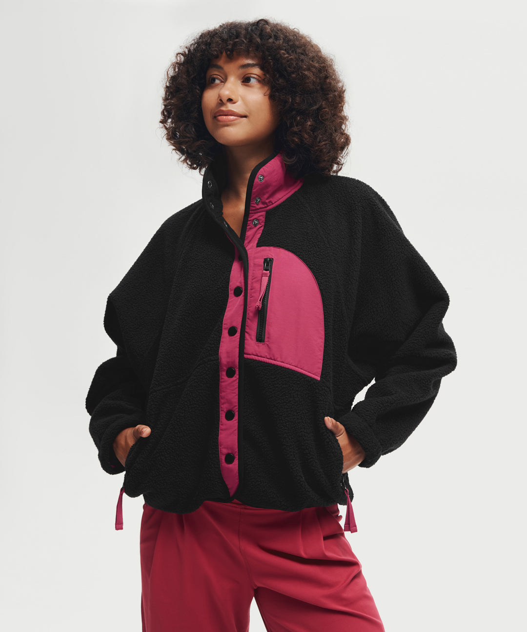 Stay warm, stay wild. This plush fleece brings major cozy energy with a modern edge—relaxed, oversized, and ready for anything. Soft sherpa texture meets sleek nylon detailing for that off-duty-cool vibe you’ll live in all season.